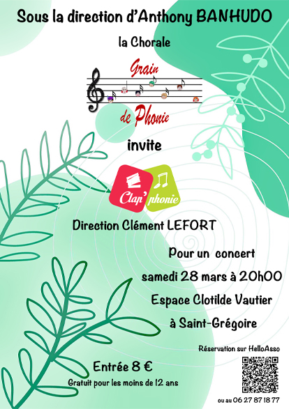La nouvelle chorale de Saint Grégoire « Grain de Phonie » dirigée par notre chef Anthony Banhudo, bien connu dans la région rennaise pour son professionnalisme, vous invite à un concert le samedi 28 mars à 20h00 (ouverture des portes à 19h30), salle Clotilde Vautier, rue de Brocéliande.